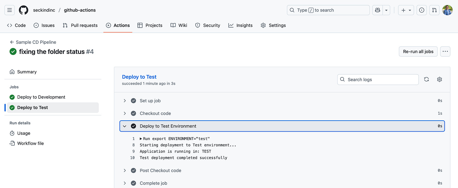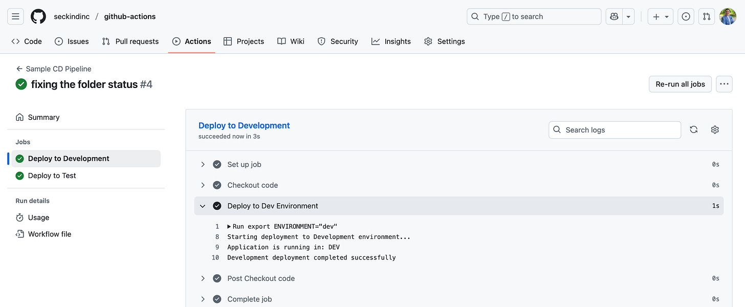 Automated Deployment Phase: After merging to main, the CD pipeline takes over automatically. The development environment deployment runs first, providing an immediate validation that your code works in a controlled environment. This stage uses the development environment configuration and runs without any manual intervention.