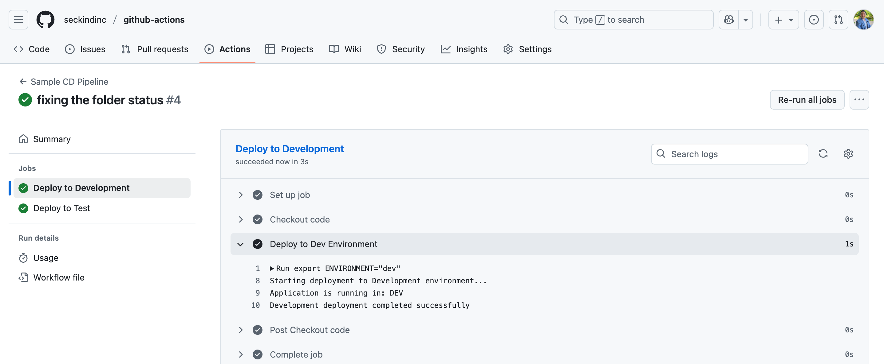 The development deployment will start immediately and complete automatically. You'll see logs showing "Application is running in: DEV" confirming that the deployment reached the correct environment with proper configuration.