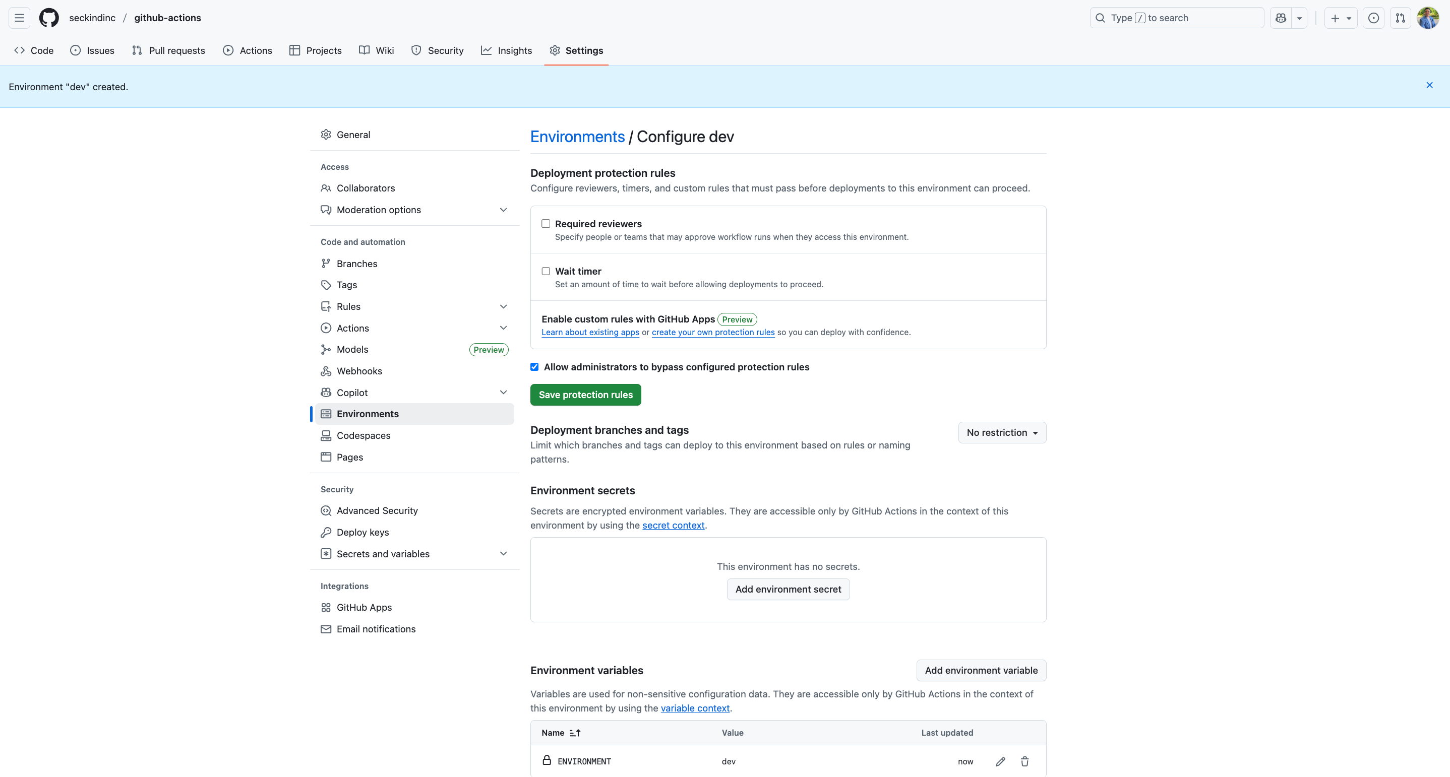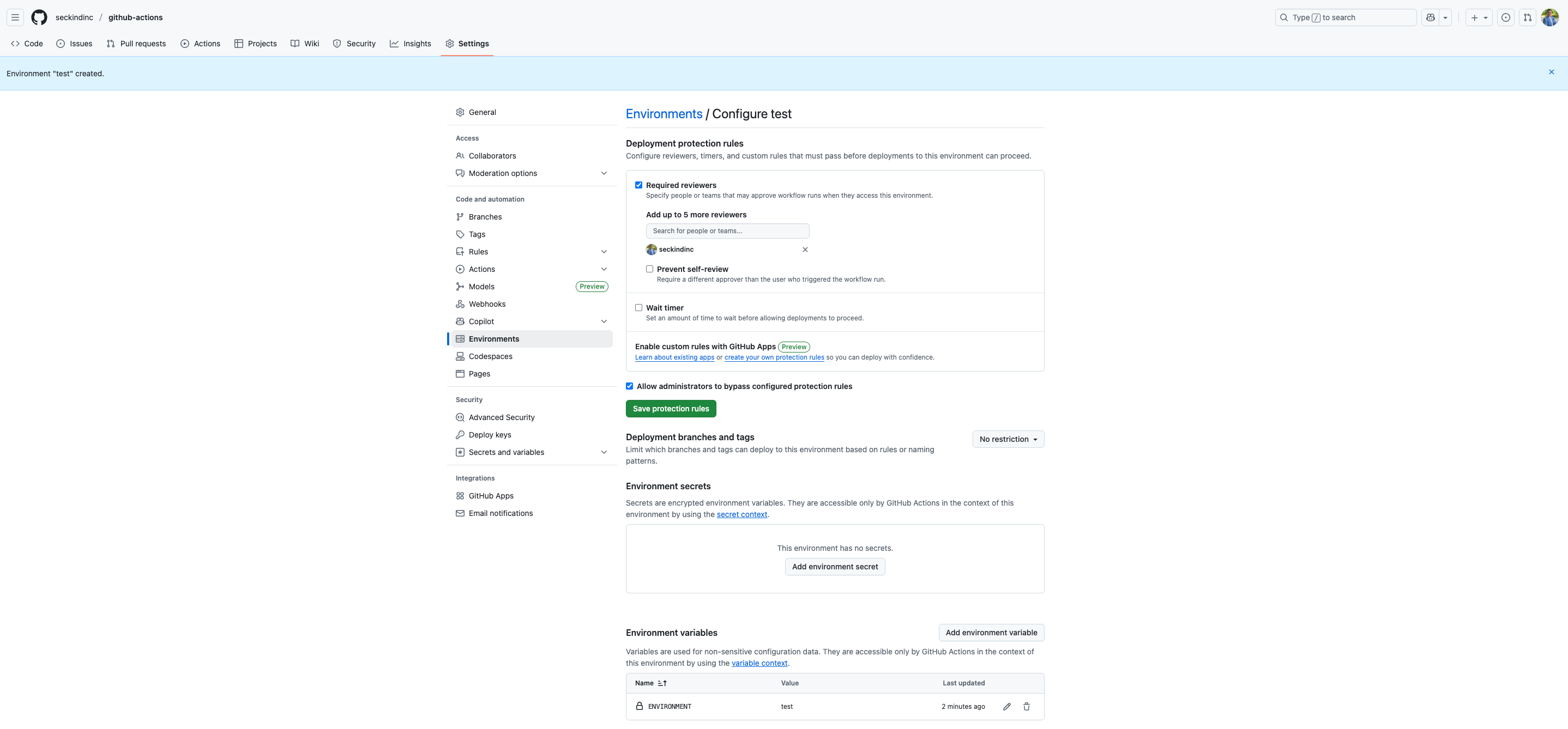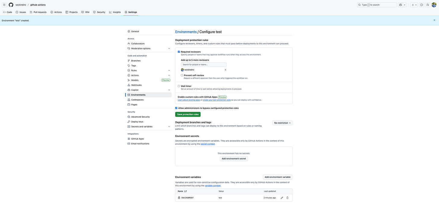 The environment setup serves several critical purposes. First, it provides isolation between different stages of your application, ensuring that development activities don't interfere with testing or production systems. Second, it allows you to configure different settings for each environment, such as database URLs, API keys, or feature flags. Third, it enables protection rules like requiring approvals before deploying to sensitive environments like production.