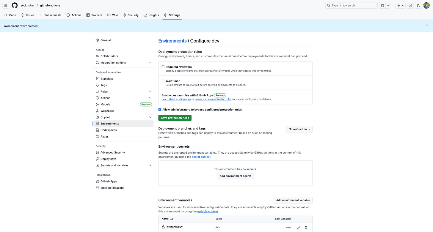 Navigate to your repository settings and click on "Environments" in the left sidebar. Create a new environment called "dev" and add an environment variable called ENVIRONMENT