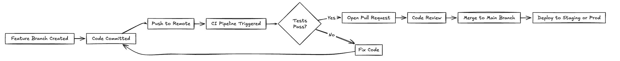 When the feature is complete and tests are passing, the developer opens a pull request (or merge request, depending on platform). This step invites teammates to review the code, suggest changes, and ensure consistency with architectural and quality standards. CI systems often run again at this stage to validate that the integration with the main branch will be safe.